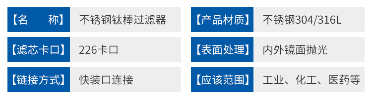 鈦棒過濾器采用 304或316L 不銹鋼材料作外殼,內(nèi)部濾芯為鈦管,具有耐高溫、高壓、強(qiáng)酸、強(qiáng)堿、耐腐蝕,濾芯可反復(fù)再生使用等特點(diǎn),是采用粉末冶金方法將鈦金屬粉末未通過高溫?zé)Y(jié)的方法加工制成的空心濾管,它廣泛地應(yīng)用于食品、飲料、醫(yī)藥、化工等行業(yè)的液固分離,在制藥行業(yè)尤其適用于大輸液和針劑生產(chǎn)線中的脫碳過濾。此系列產(chǎn)品具有結(jié)構(gòu)緊湊造型美觀按 GMP 標(biāo)準(zhǔn)生產(chǎn),管件連接采用國際標(biāo)準(zhǔn)快裝式連接,拆裝清洗方便。